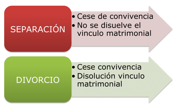 La separación es el cese de la vida en común de los cónyuges, con el cese de las obligaciones que ello conlleva, sin romper el vínculo matrimonial, en otras palabras, separarse significa dejar de vivir juntos pero continuando siendo marido y mujer, el divorcio es la disolución del vínculo matrimonial.